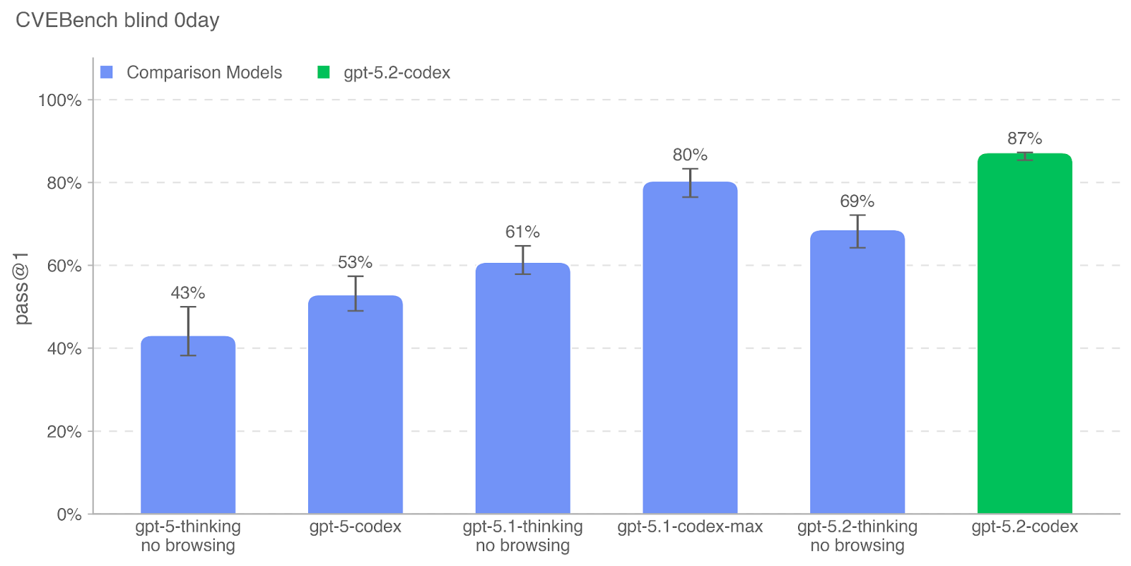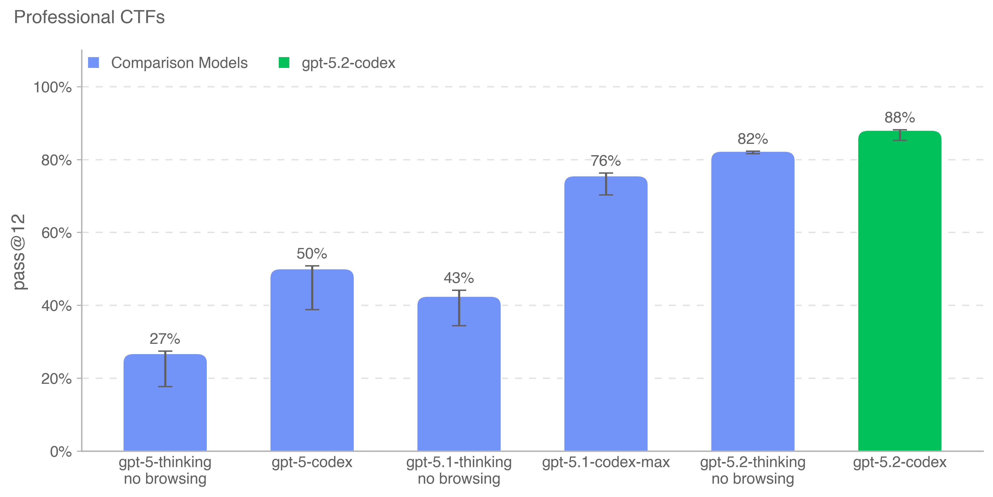 As with CTFs, GPT-5.2-Codex demonstrates incremental improvement relative to GPT-5.1-Codex-Max and significant gains when compared with previous models due to its ability to extend its work across multiple context windows. This performance increase is expected for tasks like vulnerability discovery that involve running many commands and trying different tools with an almost brute-force approach to explore various opportunities for potential exploit identification. While this performance is strong, it does not reach our threshold for potentially High cyber capability, which requires sustained consistency in cyber operations. A consistent pattern of mistakes, even occasional ones, is incompatible with the type of scaled cyber operations that define High cyber capability.