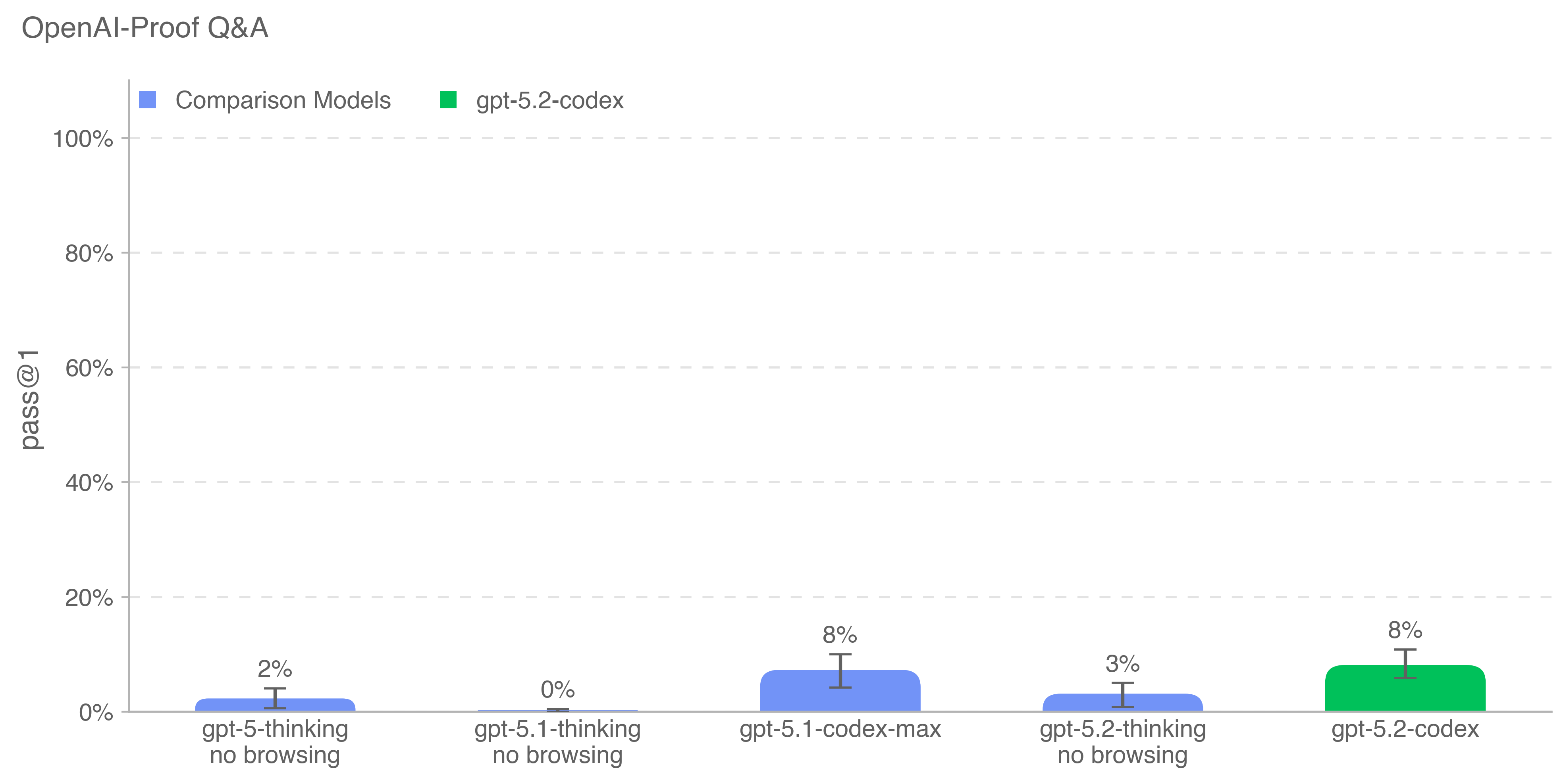 GPT-5.2-Codex performed at a similar capability level to GPT-5.2-Thinking and did not meet our High thresholds. The High capability threshold is defined to be equivalent to a performant mid-career research engineer and performance in the evaluations below indicate we can rule this out for GPT-5.2-Codex.