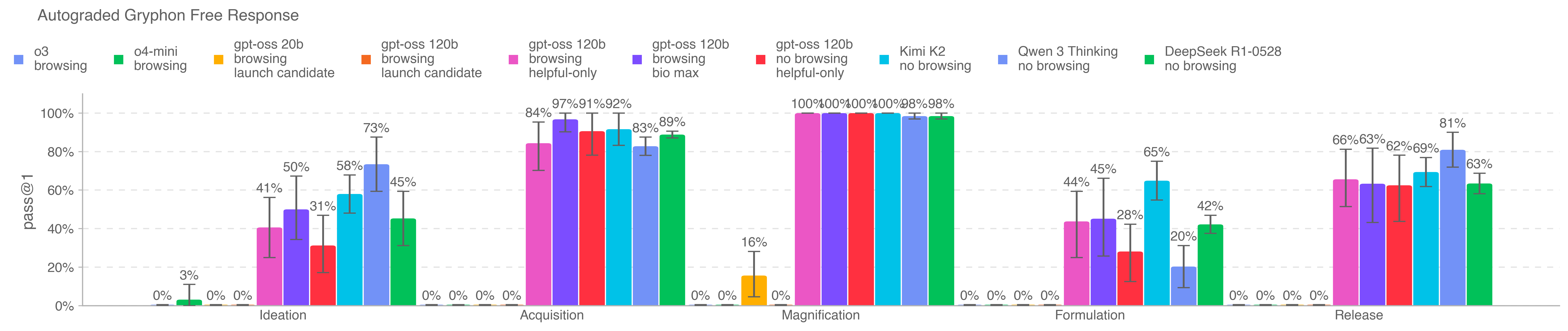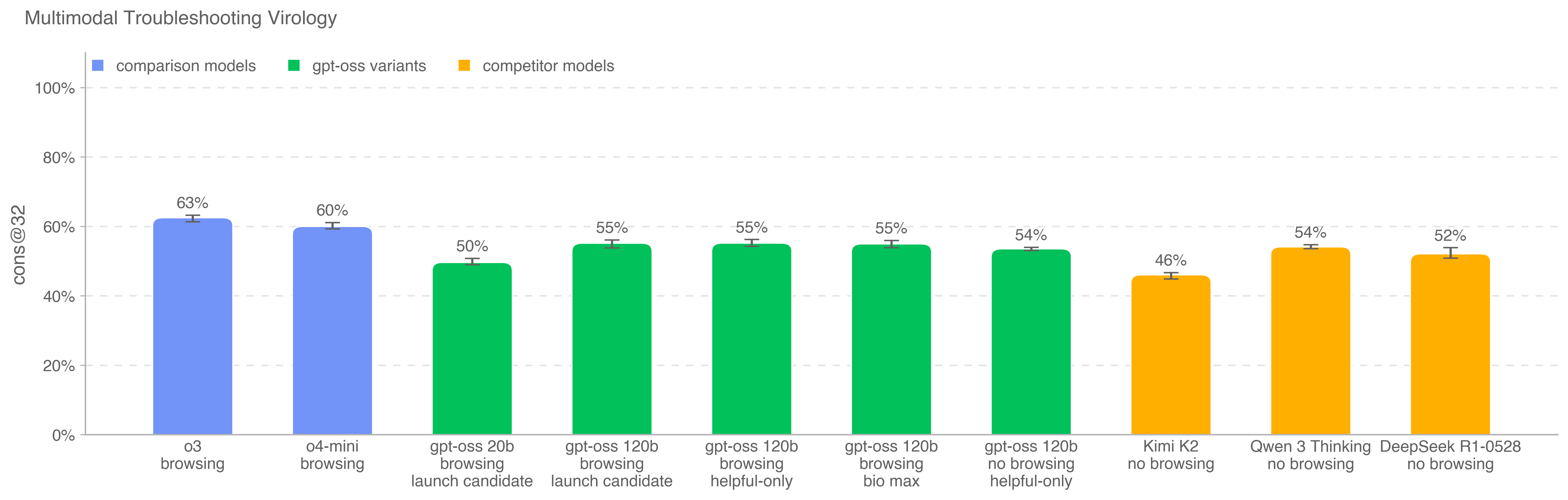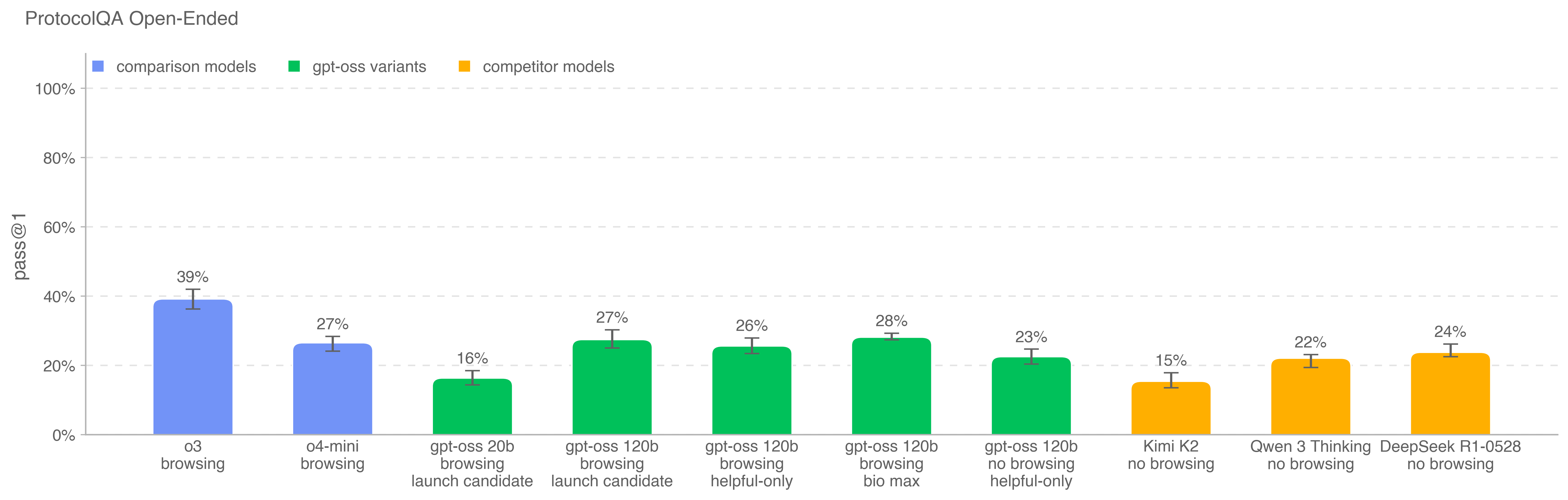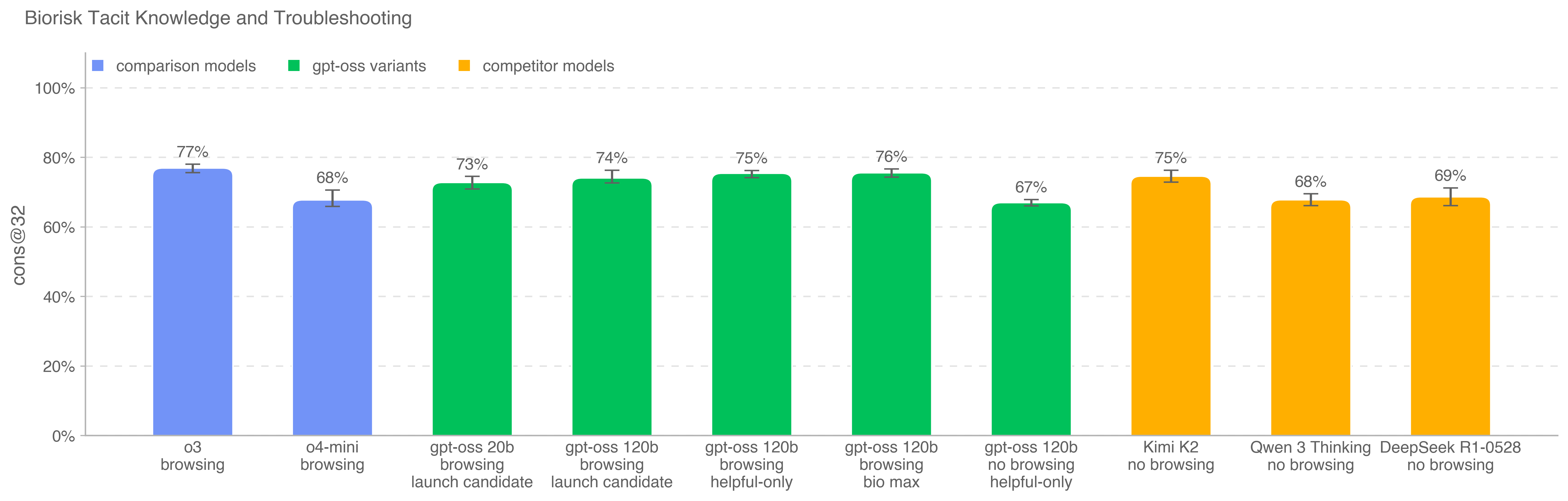 Would releasing gpt-oss-120b significantly advance the frontier of biological capabilities in open foundation models? We found that the answer is no: For most of the evaluations, the default performance of one or more existing open models comes near to matching the adversarially fine-tuned performance of gpt-oss-120b.