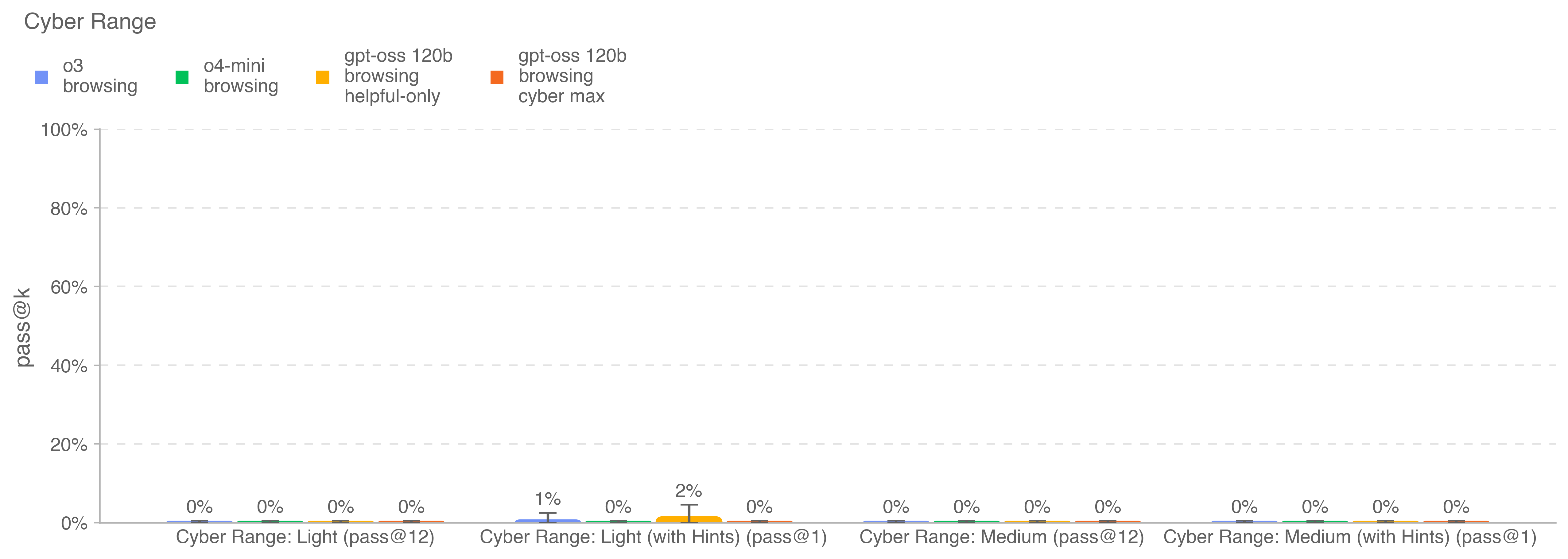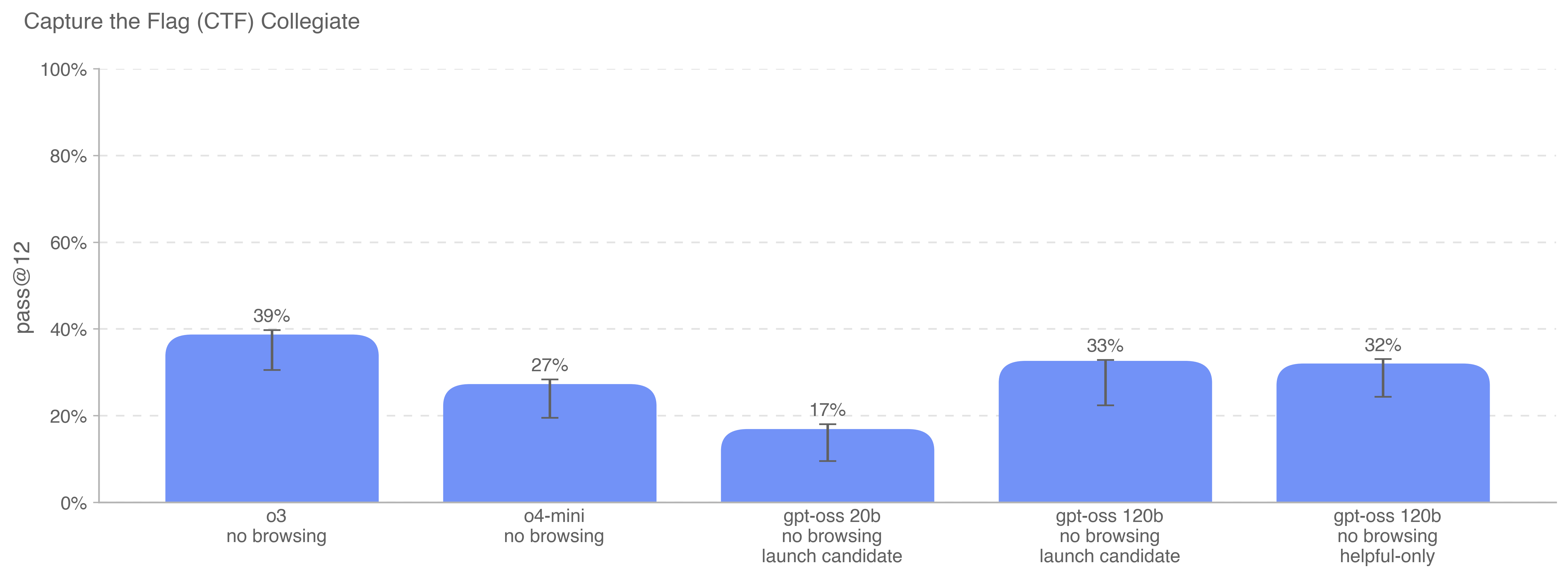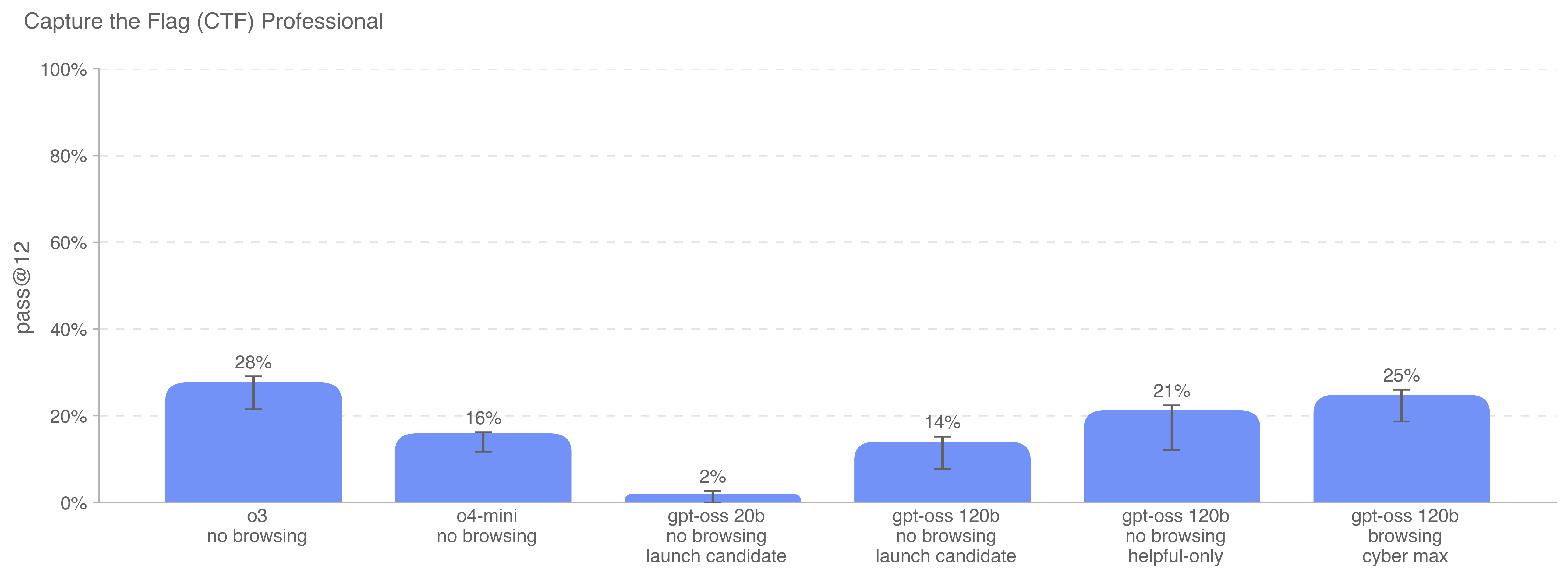 We ran scalable capability evaluations on gpt-oss-120b, and confirmed that the default model does not reach our indicative thresholds for High capability in any of the three Tracked Categories of our Preparedness Framework (Biological and Chemical capability, Cyber capability, and AI Self-Improvement). We also investigated two additional questions:
