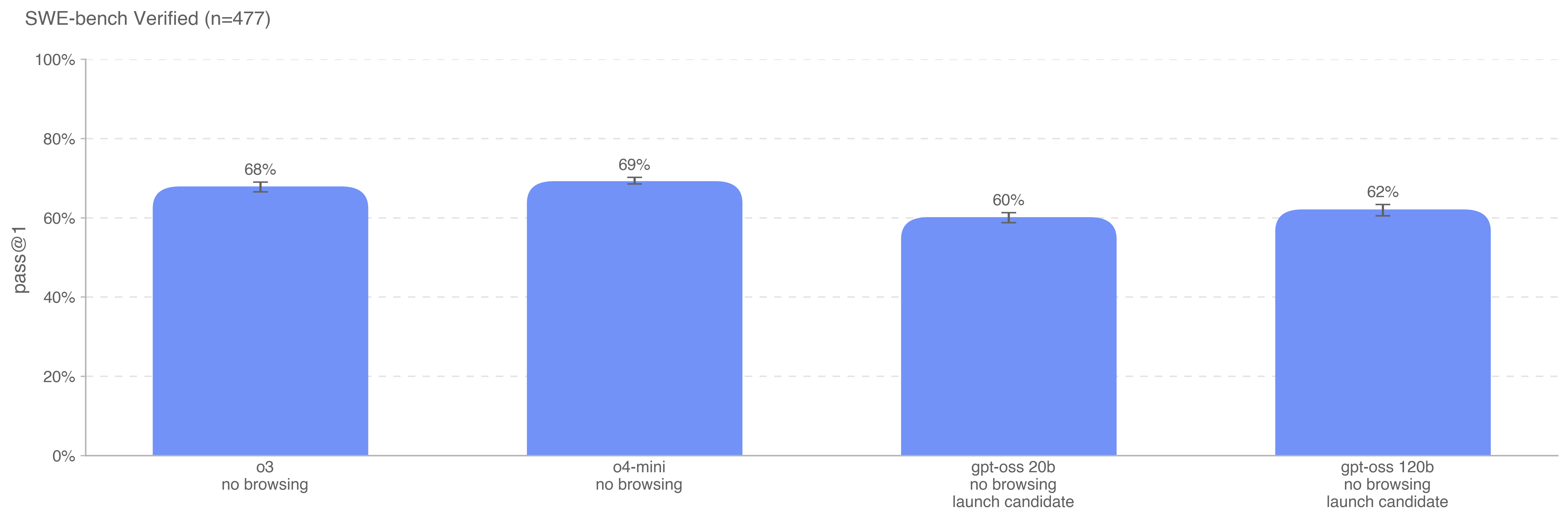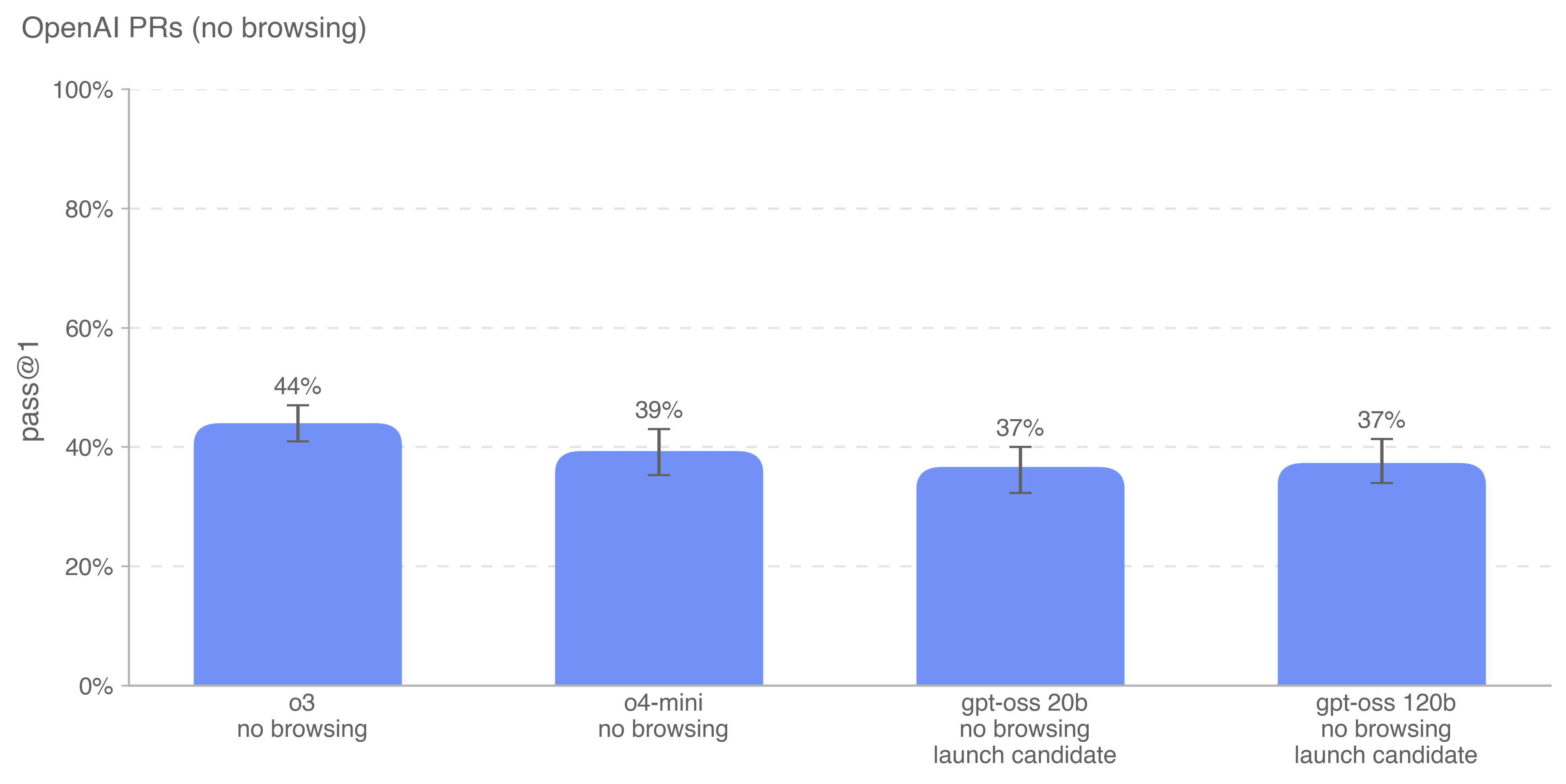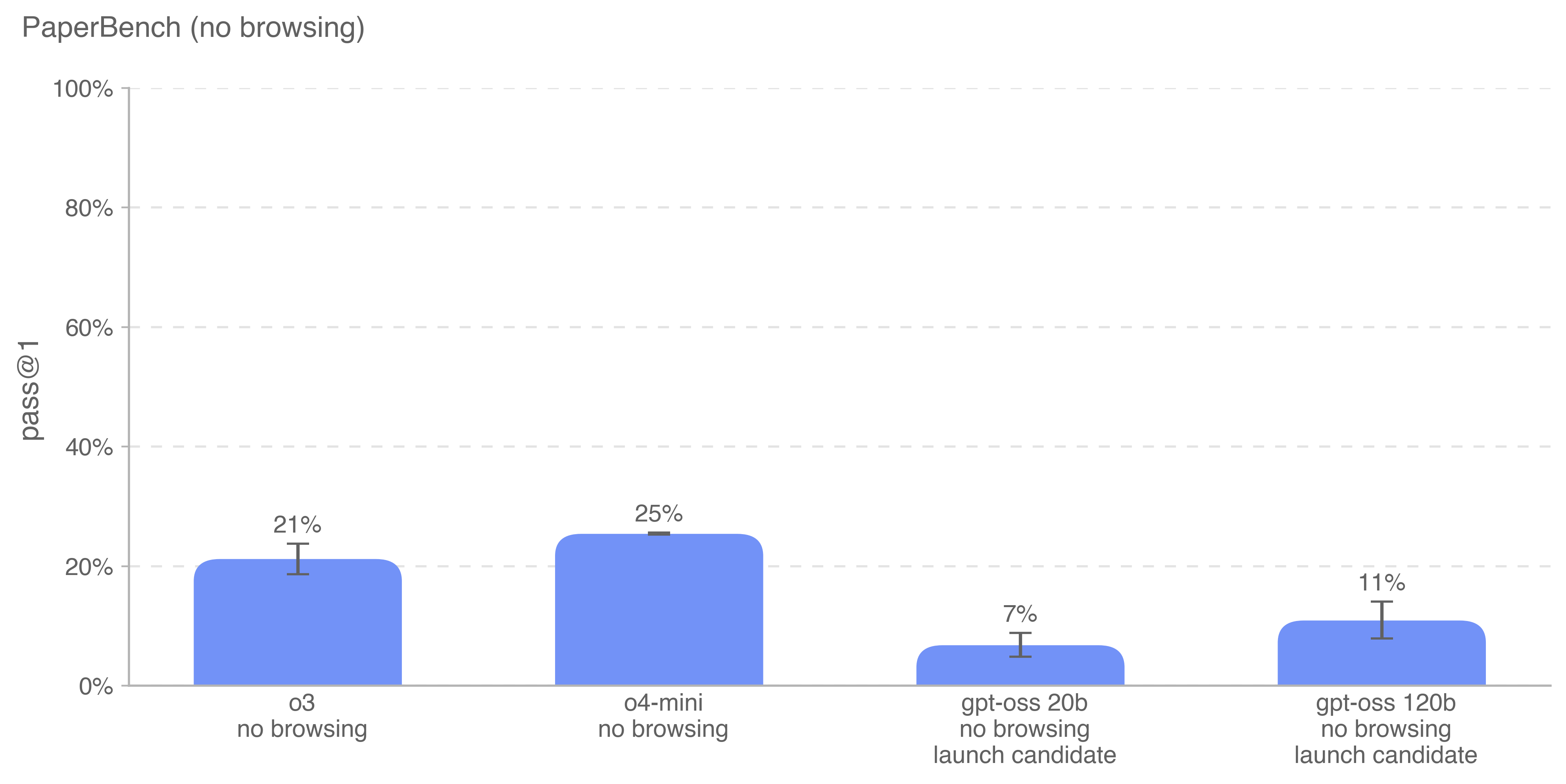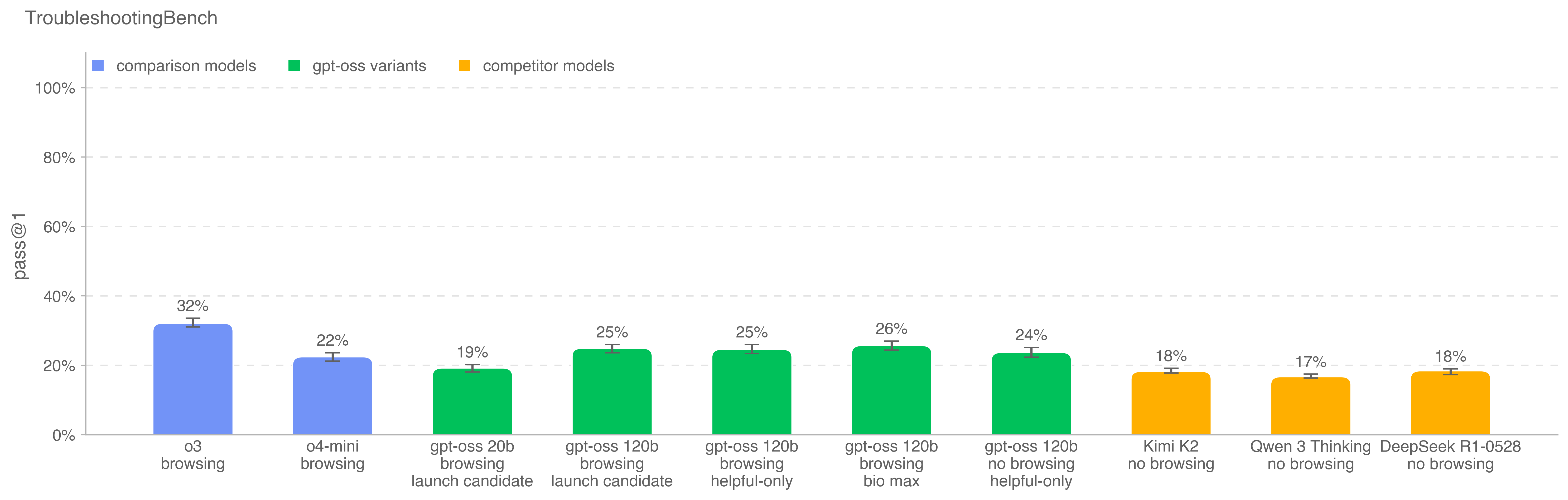 We ran scalable capability evaluations on gpt-oss-120b, and confirmed that the default model does not reach our indicative thresholds for High capability in any of the three Tracked Categories of our Preparedness Framework (Biological and Chemical capability, Cyber capability, and AI Self-Improvement). We also investigated two additional questions: